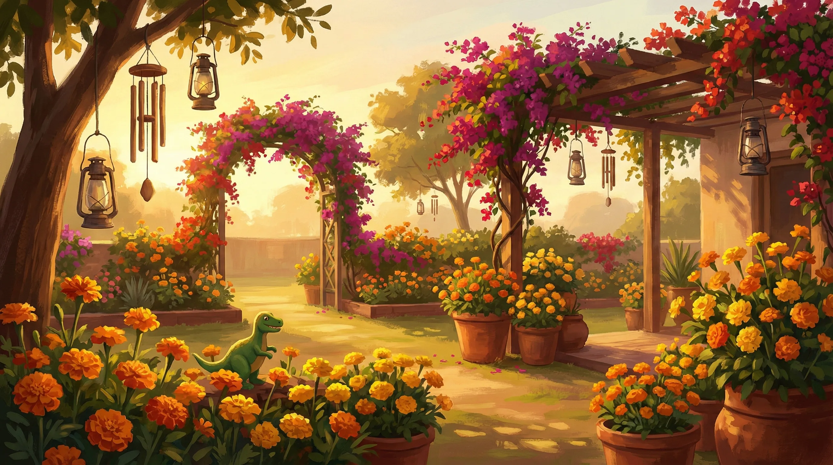 What followed was a gentle rescue mission. Vegetables were retrieved with care. Soil was smoothed. Displaced marigolds were comforted and replanted. Pots that had been shifted to make space were returned. The dinosaur remained. Removing it would have felt disrespectful.